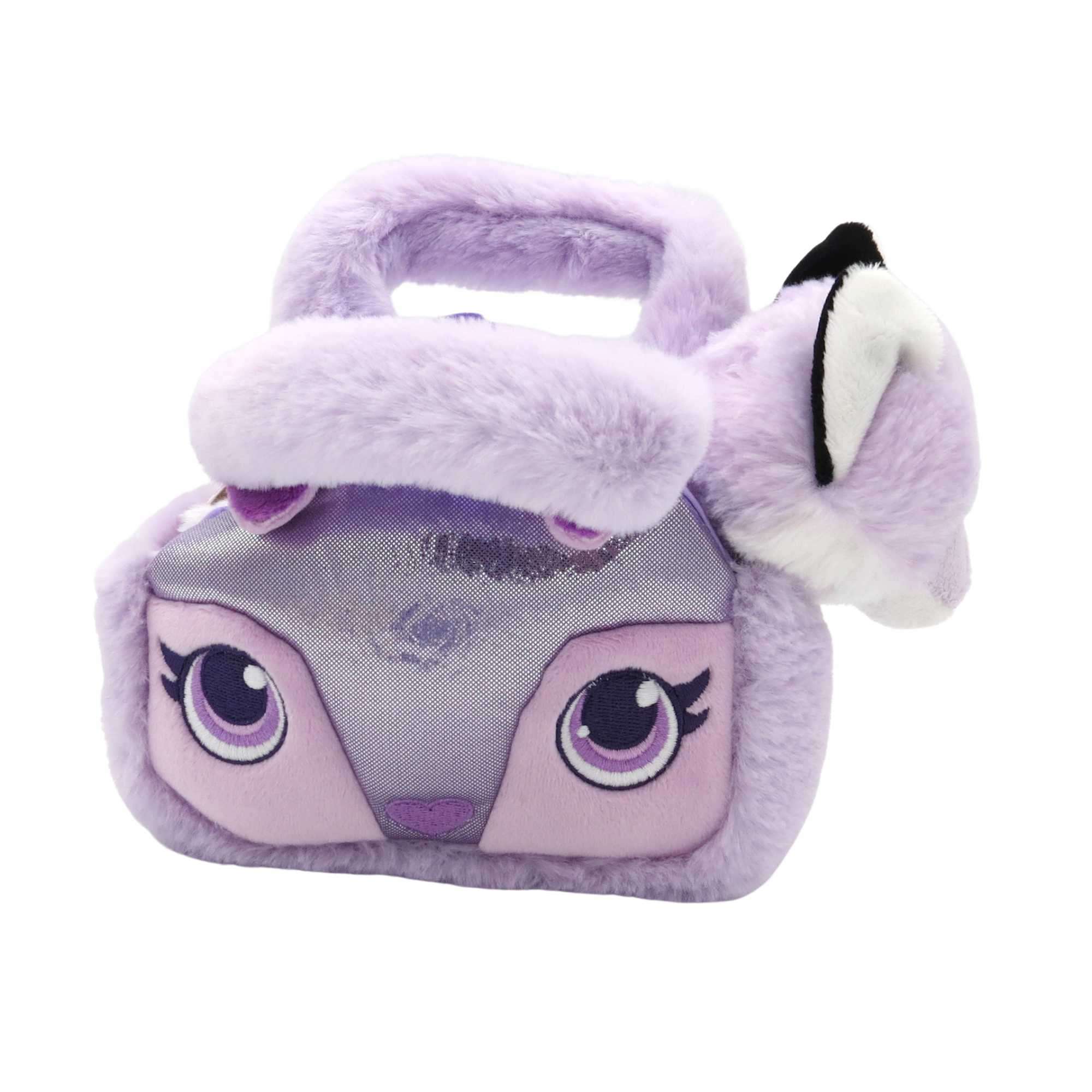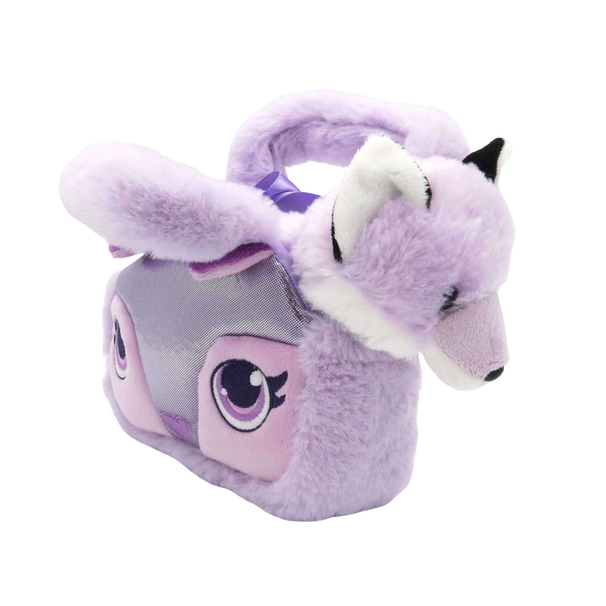 Der süße Fuchs mit fliederfarbenem Fell kommt in einer kleinen Handtasche mit kuscheligen Griffen daher.